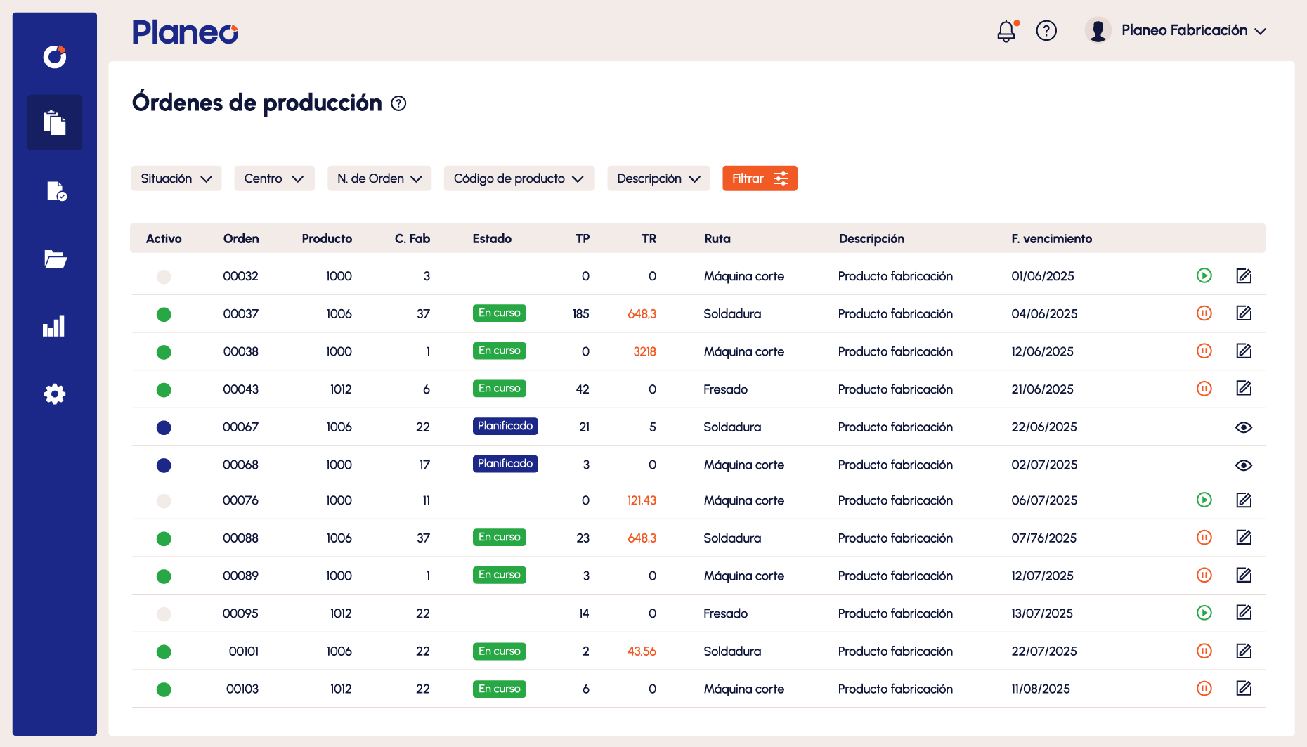 Con PlaNeo, cada operario, máquina o centro de trabajo queda configurado en un solo sistema, lo que permite asignar tareas de forma ágil y transparente. Al recopilar y actualizar datos en tiempo real, la plataforma te ofrece una visión completa de quién está trabajando en cada orden, qué máquinas están disponibles y cuáles requieren mantenimiento o están en pausa. Así, evitas cuellos de botella, optimizas tus recursos y garantizas que cada persona y cada equipo se empleen de la forma más eficiente posible.