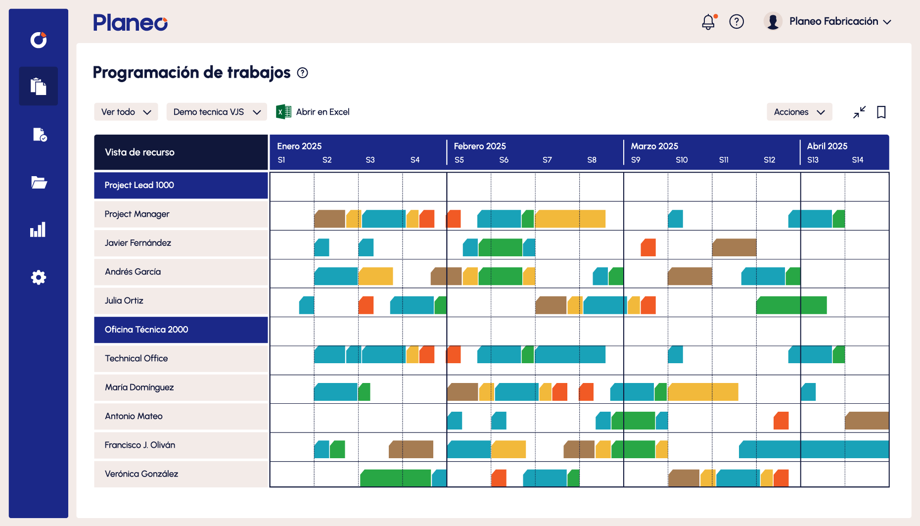 PlaNeo te ofrece una visión completa y en tiempo real de todo tu proceso de fabricación, desde la preparación de órdenes hasta el control final de la producción.